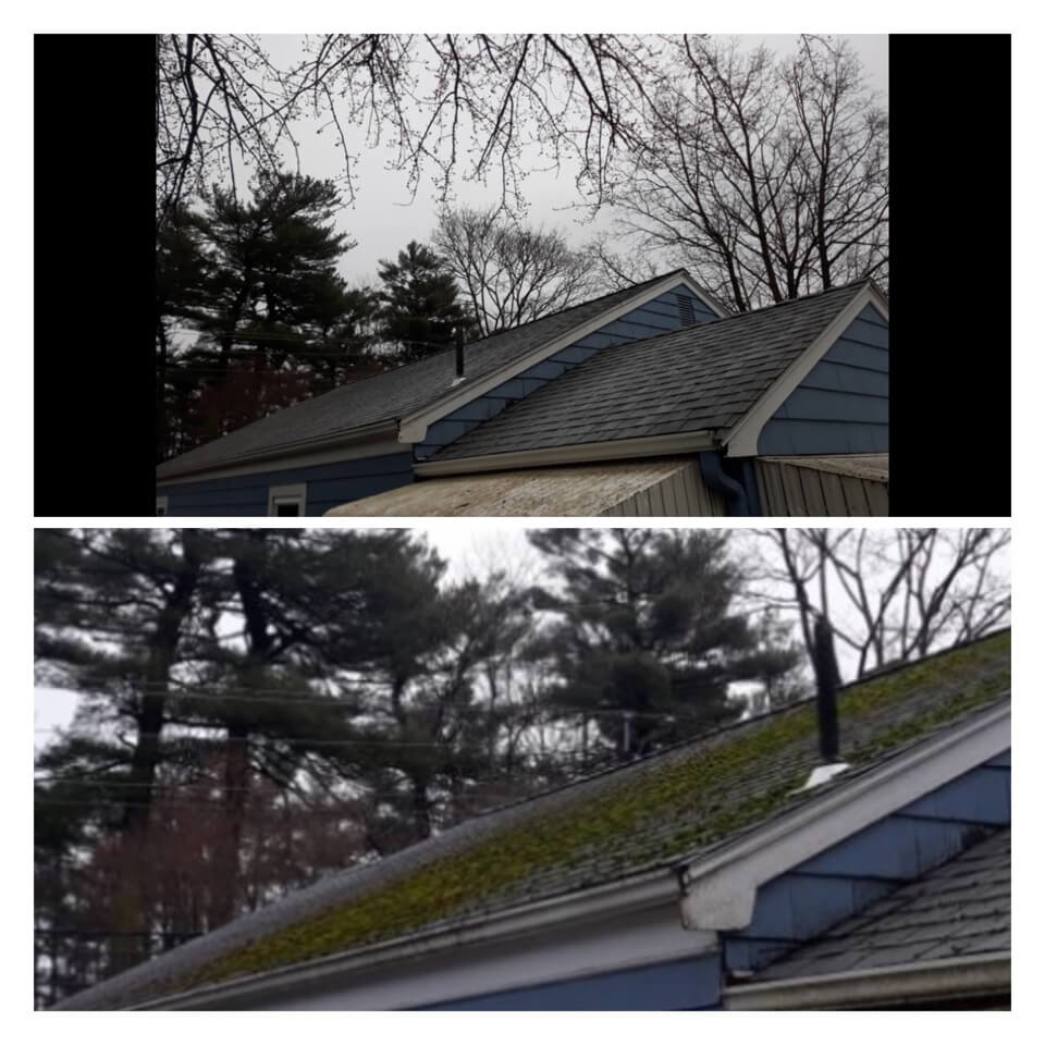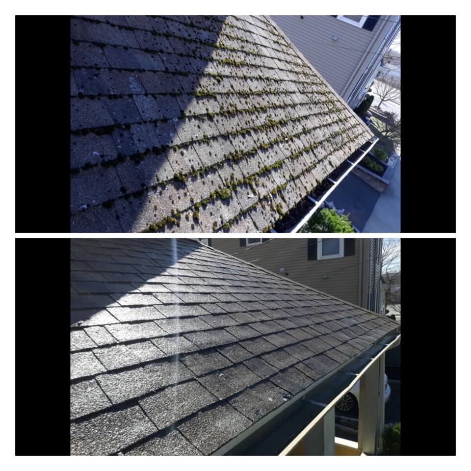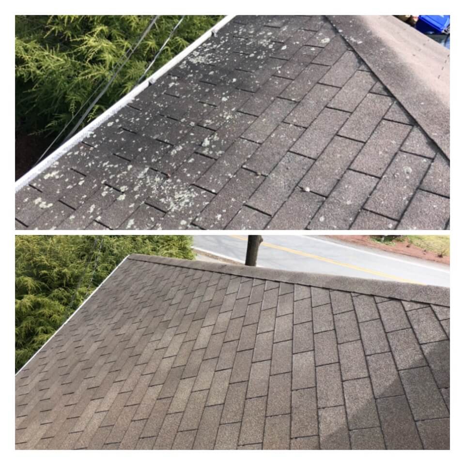 HiCleaners is the most experienced company in Amherst, NH that deals with roof washing and roof soft washing. All of our employees are trained to recognize precise solution mixing ratios to provide you with the safest and most effective soft washing service. Roofs are a commonly neglected part of a house due to the fact that most people don’t have ladders to access it, so it is very easy to just leave it alone and forget about problems that may start to arise. Just like many home owners, discoloration and small bits of moss on a roof can be overlooked because of the misconception that it is just aesthetic. However, it isn’t just aesthetic, the moss slowly lifts the granules off the shingles which in turn shorten the life of the shingle. The moss also spreads, just like any bacteria if it is left alone for too long, it can quickly become a problem that spirals out of control. Call HiCleaners for a free quote, we only use the most advanced eco-friendly solutions and equipment to make sure the job is done right, for the safety of the employees, your plants, grass, pets, and children.